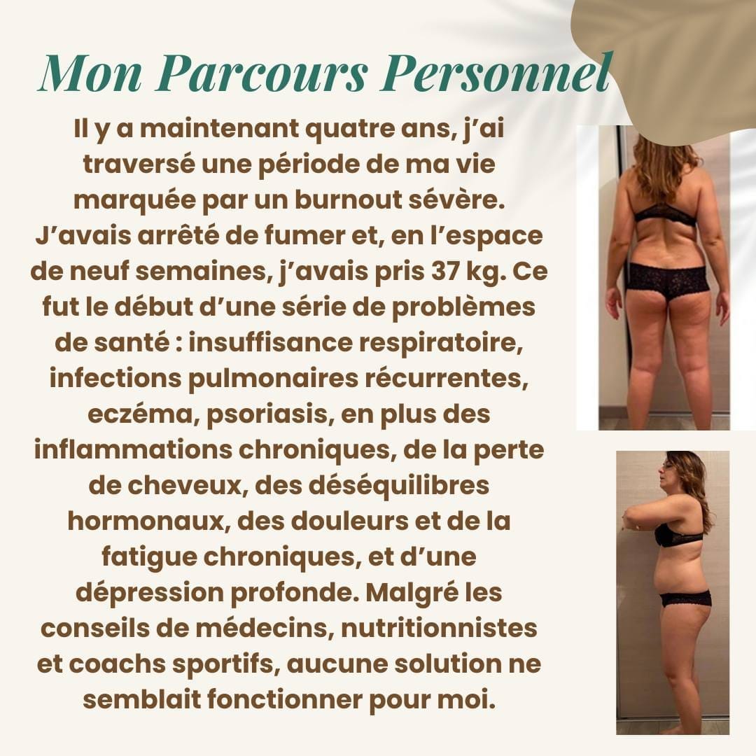 Le choc émotionnel de mon burnout, combiné à l'arrêt de la cigarette et à la perte tragique de ma grand-mère, a ravivé tous mes maux. J'ai pris 37 kg en quelques semaines, mon système immunitaire s'est affaibli, j'ai souffert d'acidose, de perte de cheveux, de déminéralisation dentaire, de problèmes digestifs et de graves problèmes hépatiques une stéatose très sévère. Malgré les conseils médicaux, les diététiciens, nutritionnistes et coachs sportifs, rien ne semblait fonctionner.