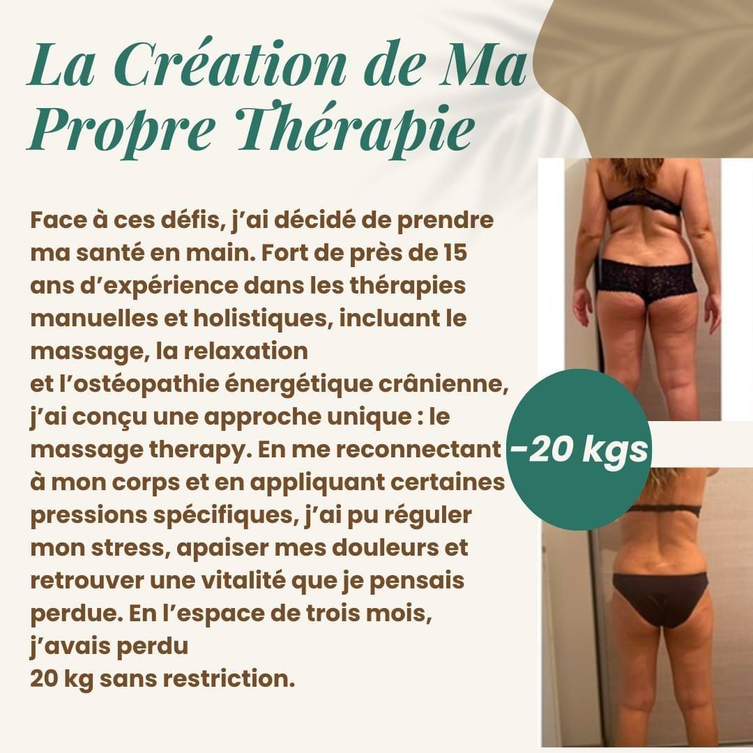 C'est la peur de mourir qui m'a fait réagir, j'ai décidé de reprendre les rênes en me reconnectant à mon corps grâce à un auto-massage précis que j'ai développé au fil des semaines. Cela est devenu ma propre thérapie corporelle, axée sur la libération de tensions, d'émotions et de cristallisations, sans la pression d'un régime strict ou d'un exercice physique intense.
