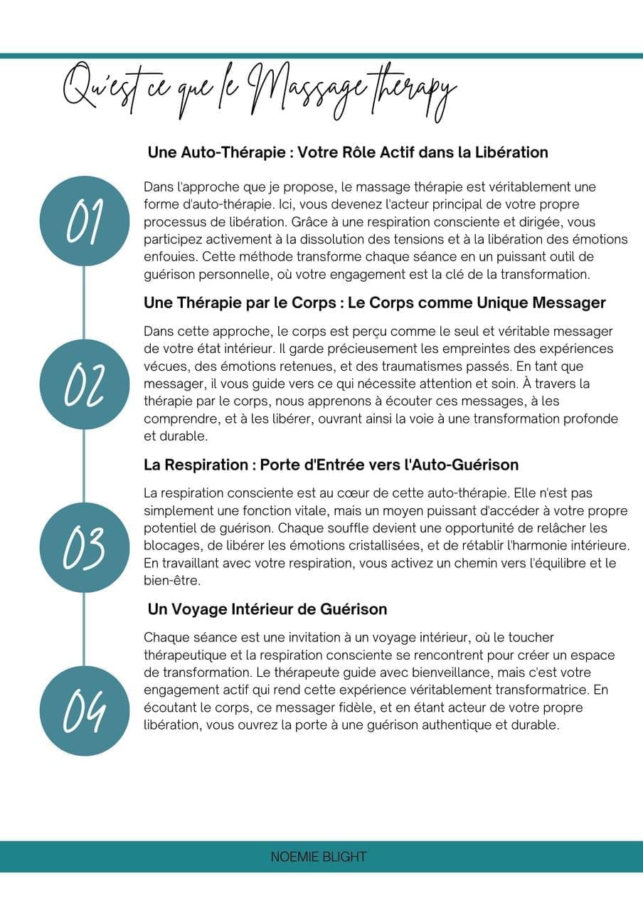 Ce parcours de découverte et de guérison m'a permis de créer un protocole unique, s'inspirant des techniques que j'ai maîtrisées au cours des 15 dernières années. Cela a commencé il y a trois ans comme une méthode partagée avec mes amies, évoluant vers ce qui est aujourd'hui connu comme mon massage thérapie. Aujourd'hui, je suis enthousiaste et prête à partager cette expérience transformative à travers une formation .